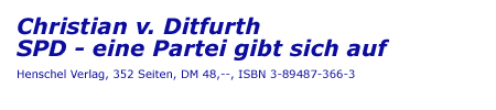 Aus der Verlagsankündigung:Nachdem sich die Wogen um den Spendenskandal der CDU geglättet haben, richten sich alle Blicke wieder auf die SPD und die Arbeit der Regierung. Nach zwei Jahren des freien Falls unter die 30%-Marke scheint sich die SPD wie ein Phönix aus der Asche zu erheben. Doch die ersten kurzfristigen Erfolge lenken von den eigentlichen Problemen der Partei ab. Denn hinter allen Modernisierungsparolen verbergen sich programmatische Dürftigkeit und politische Orientierungslosigkeit. Christian v. Ditfurth zeigt in seinem spannend zu lesenden historisch-politischen Essay, wie sich die Identität der deutschen Sozialdemokratie seit ihrer Gründung verändert hat. Die SPD hatte trotz aller Wandlungen Erfolg, weil sie ihren Grundsätzen treu blieb. Mittlerweile ist hiervon aber nur das billige Pathos des Schröder-Blair-Papiers geblieben. Laut Gerhard Schröder gibt es keine sozialdemokratische Wirtschaftspolitik. Innenminister Otto Schily sieht sich in der Kontinuität seines christdemokratischen Vorgängers. Verteidigungsminister Rudolf Scharping musste während des Krieges gegen Jugoslawien durch die konservative Opposition zur Mäßigung gemahnt werden. Wenn es also keine sozialdemokratische Politik mehr gibt, warum muss es dann noch eine sozialdemokratische Partei geben?